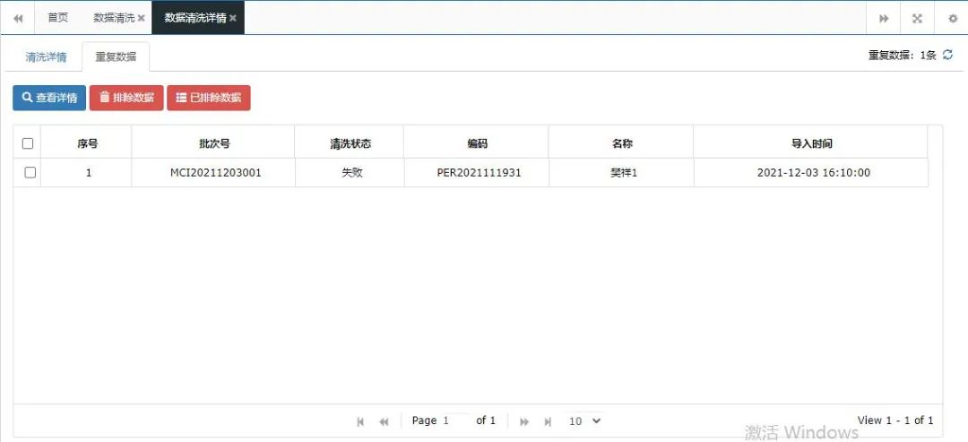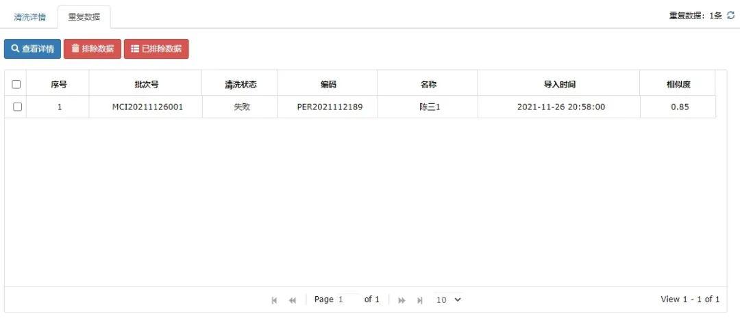 清洗导入表与重复数据表相互关联,通过清洗ID可以查询到某条数据的和它重复的数据信息,也可以直接查询所有重复数据。和错误信息表同理,也能够通过重复数据表直接筛选出有哪些重复的数据。