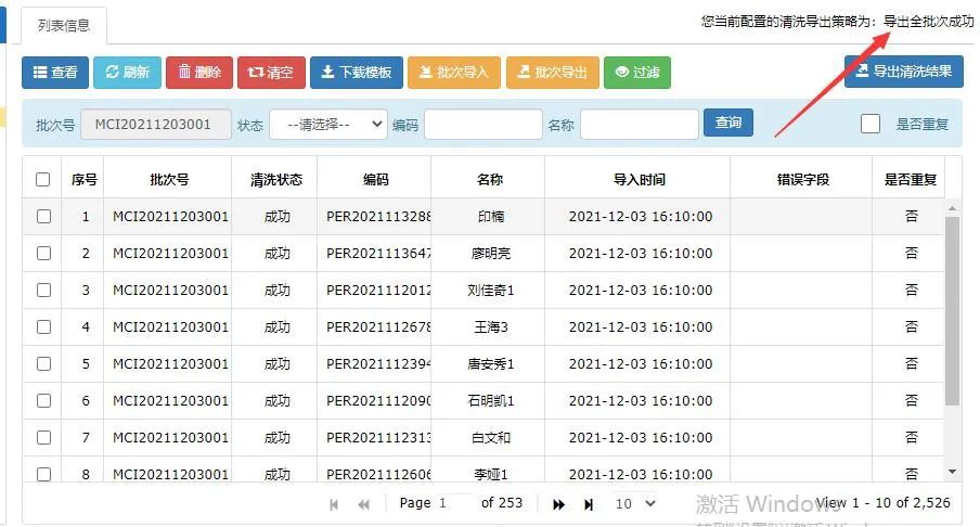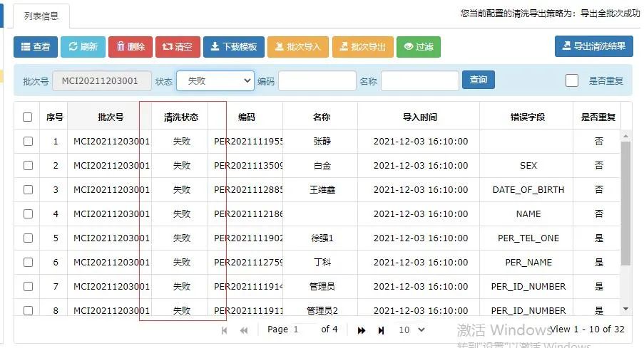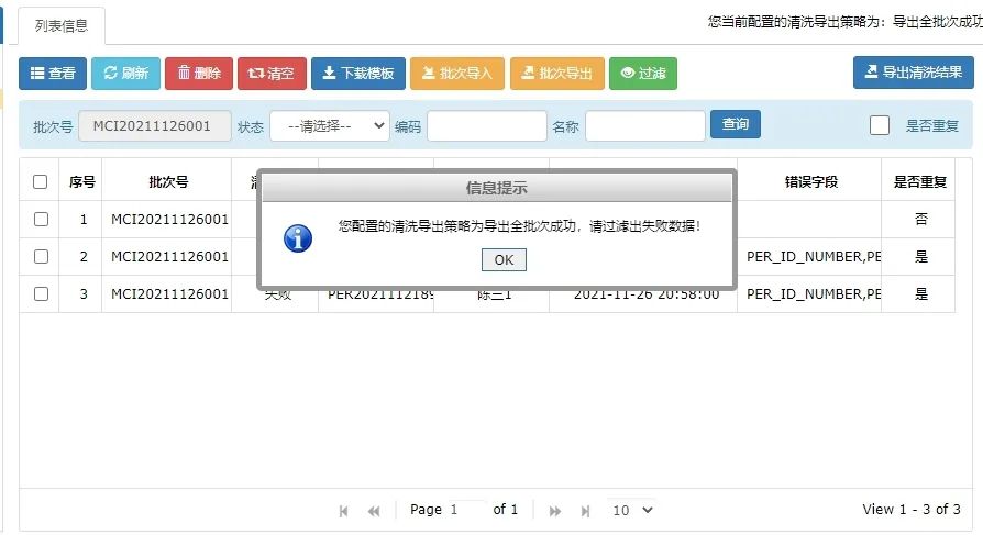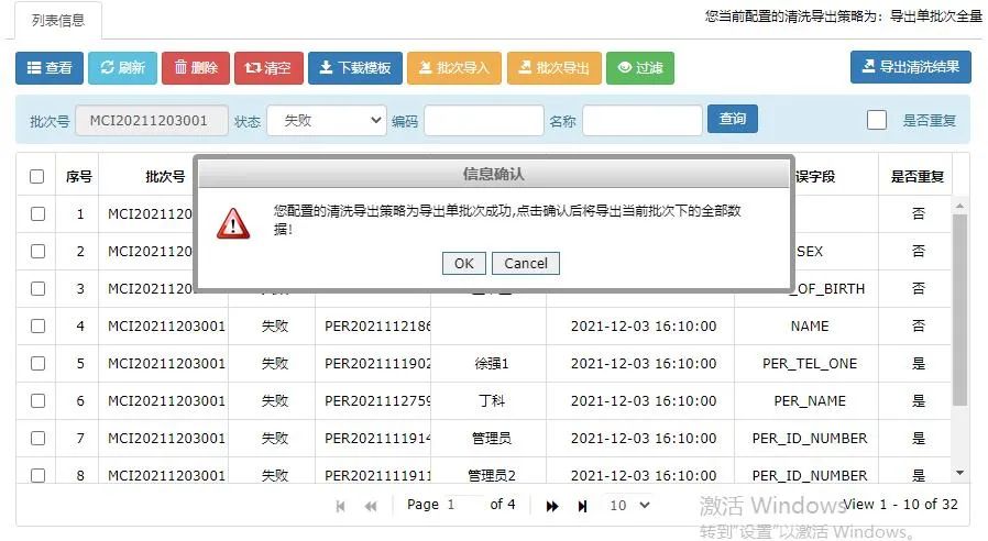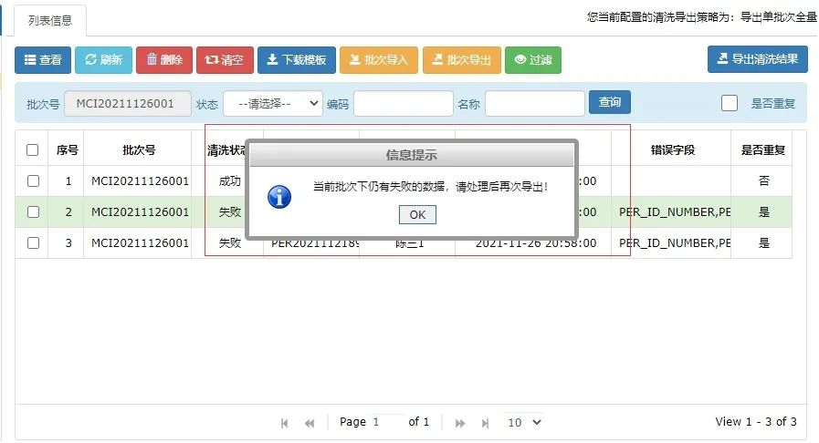 结果导出为导出最终的清洗结果,同样也根据导出策略的不同分为导出全批次成功数据和单批次全量数据,不管哪一种,只要通过导出清洗结果按钮导出的数据,一定都是清洗成功后的数据,所以如果是导出单批次全量,就需要先查询当前批次下是否有失败数据,这个需要去清洗导入表查,如果失败数据的个数大于0,说明仍存在失败数据,这个时候提示用户需要对失败数据进行操作然后再次导出。