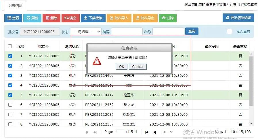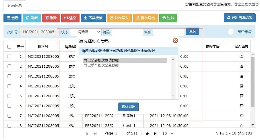 批次导出根据导出策略分为两种情况,导出全批次下失败数据和导出当前批次下全部数据,第一种情况,需要先获取当前清洗页面中的数据状态,如果不为失败,则提示用户需要先过滤出失败数据,再进行导出,如果是单批次全量,则获取当前批次号然后按照批次号进行数据的导出,具体的导出过程同选择导出。