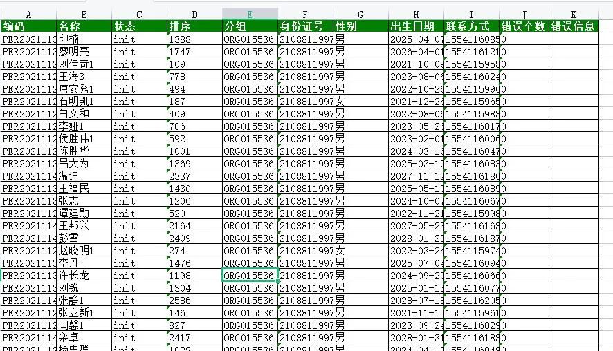 错误数据的导入需要在导入基本数据的过程中通过校验规则对每条数据的每个字段进行判断,不符合校验规则的标记为失败状态,最终对失败数据进行新增,错误字段为上面校验的字段,错误信息则是校验规则名称,新增createErrorRecords()和findCleanErrorRecords()方法,完成错误信息表数据的新增。