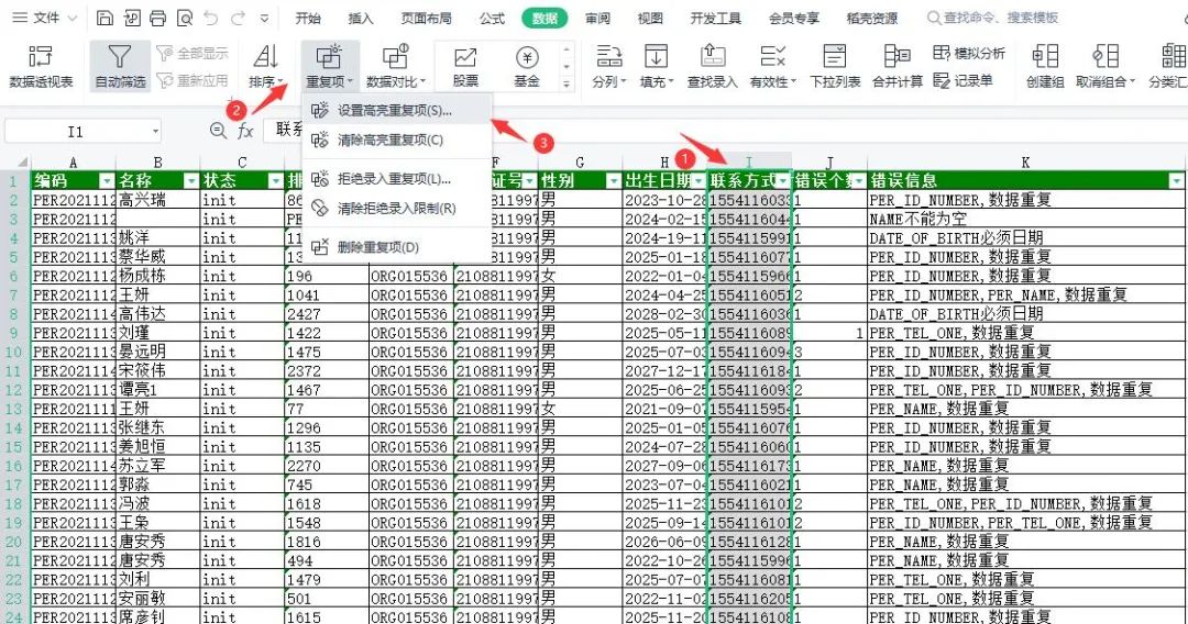 3.除了按照内容筛选之外,还可以按照颜色进行筛选。按照颜色筛选需要有筛选条件,先把数据标记出来,例如,标记出重复数据(清洗功能需要修改的一类是不符合校验规则的数据,还有就是重复的数据,所以我们需要把重复数据先筛选出来)。4.首先,选中要筛选的列,点击上方重复项按钮,选择设置高亮重复项。