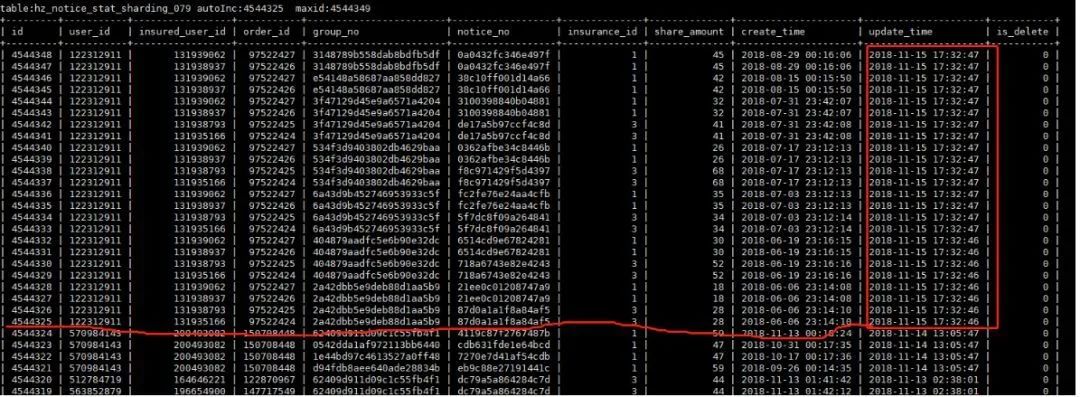 (1) 分析max id及autoincrement的规律 由于用户的表设置了ON UPDATE CURRENT_TIMESTAMP列,因此可以把所有的出错的表的max id、autoincrement及最近更新的几条记录抓取出来,看看是否有什么规律。抓取的信息如下: