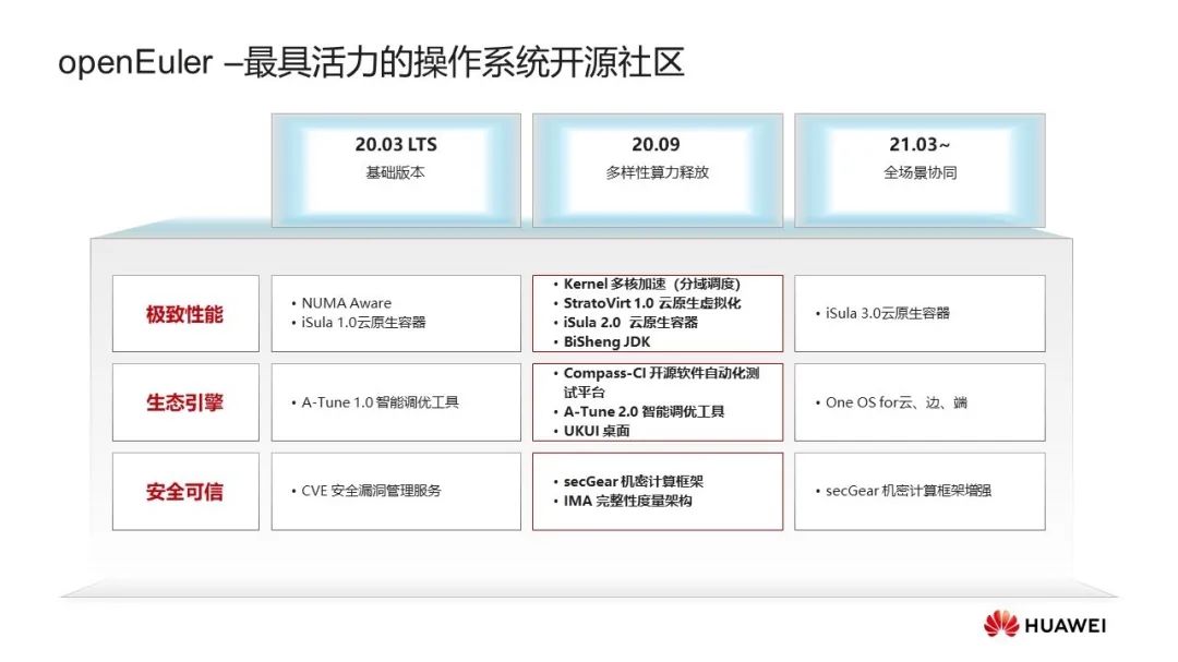 9月30日,创新版本openEuler 20.09也将正式发布,内核加八大全新发布的创新项目涵盖了Kernel多核加速、轻量级虚拟机iSula2.0、云原生容器StratoVirt,BiSheng JDK、Compass CI开源软件持续集成平台、A-Tune智能调优工具、UKUI桌面、secGear精密计算框架、IMA完整性度量框架。1+8的创新架构让 openEuler成为最具活力的开源社区。