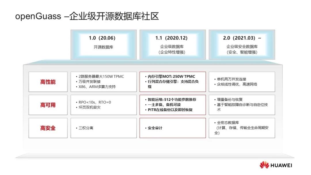 数据库是基础软件皇冠上的明珠,也是客户业务系统的核心,传统的开源数据库从性能、可用性、安全性上与实际的企业级业务应用诉求存在不小的差距,华为开源数据库openGauss致力打造企业级开源数据库,同时与合作伙伴一起紧密合作,快速发行商业版本,满足行业客户对数据库高性能、高可靠、融合处理的业务诉求。