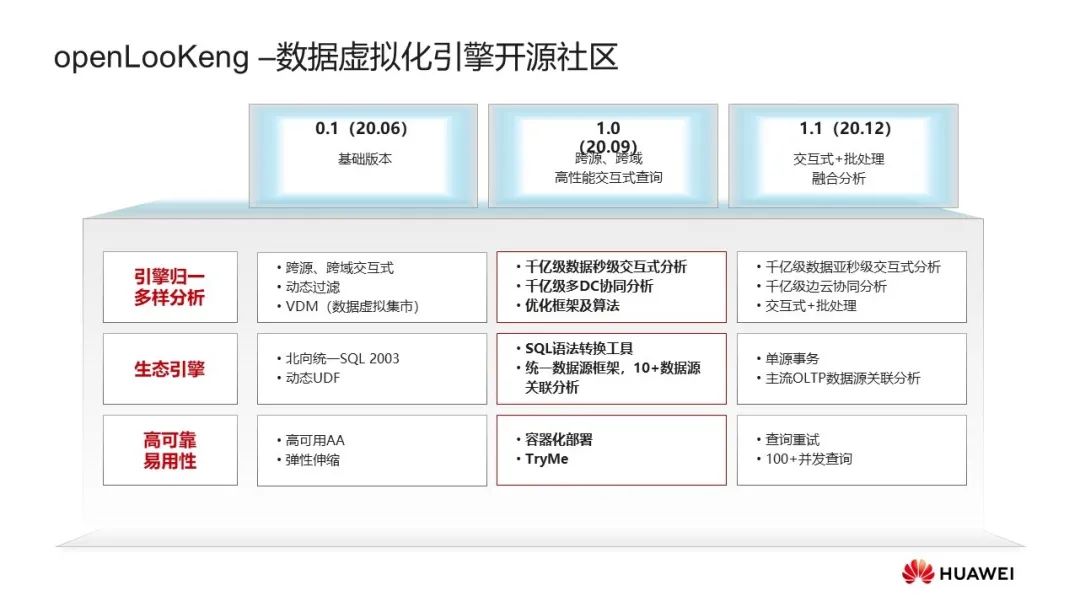 2020年9月23日openLooKeng 1.0版本已在社区发布,在实现跨源、跨域高性能交互式查询能力、提供数据虚拟超市VDM、实现数据不需要迁移或转换即可统一查询功能之外,在引擎归一多样分析上,具备千亿级数据秒级交互式分析、千亿级多数据中心协同分析。