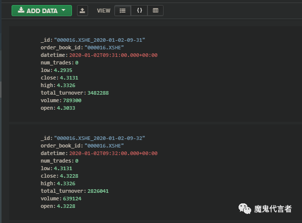 我的数据是这样储存的,_id 我这么设置首先它有唯一性,由于是分钟数据,所以我想以后查询起来都用 "-" 比较方便,但其实这无所谓,大家并不真的用_id来查东西