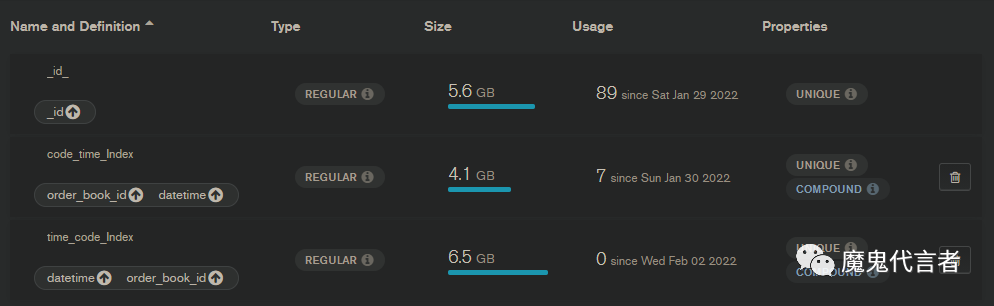 这里跟SQL数据库就不太一样,MongoDB必须要建立索引,才能根据你建立的索引进行查询,然后有时候如果查询的方式不一样,如果没用到你建立的索引,它就会一条条的读下去,对于全市场分钟数据的数据库来说,这个耗时想来就很恐怖。