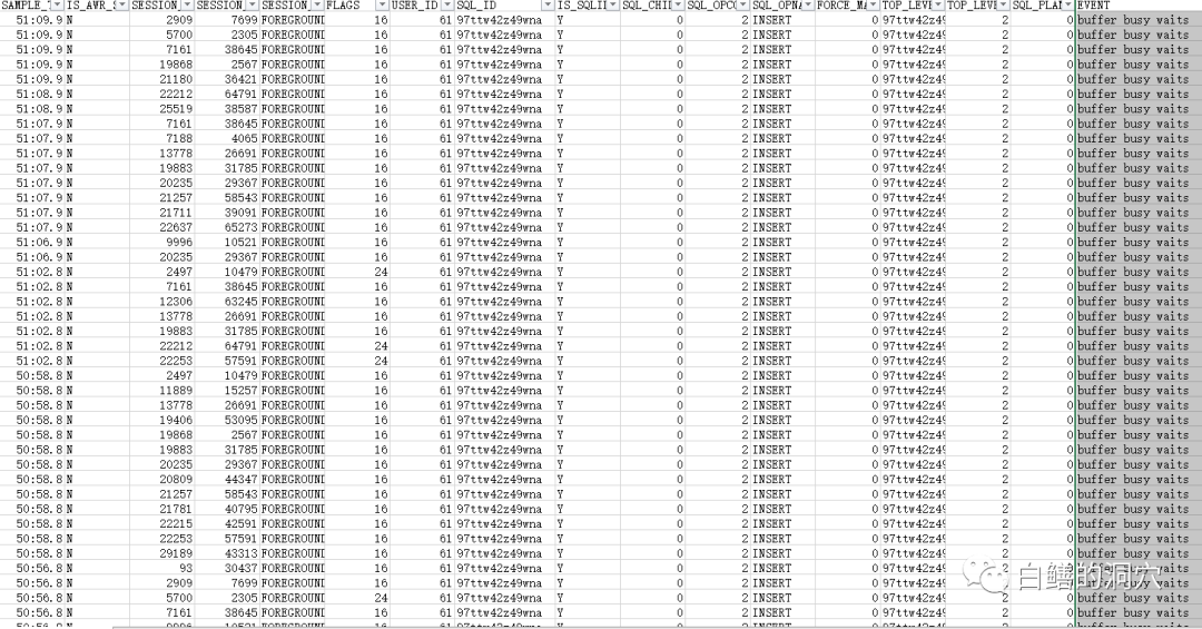 导出ASH数据后进行分析,从上面看,几乎所有的BBW等待都是一条INSERT语句引起的。