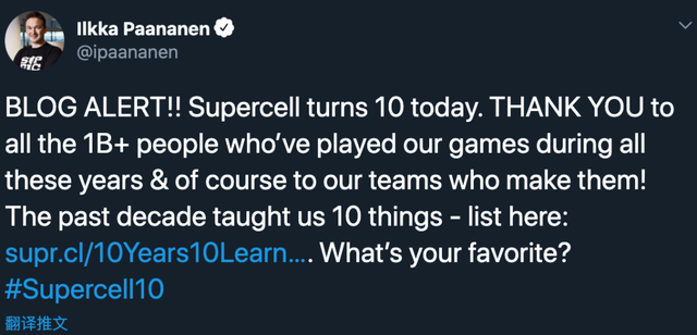 说实话,我根本不敢相信,到今天Supercell已经成立十周年了。我想感谢所有Supercell大家庭的成员、合作伙伴和以及一路以来一直支持我们的玩家们。