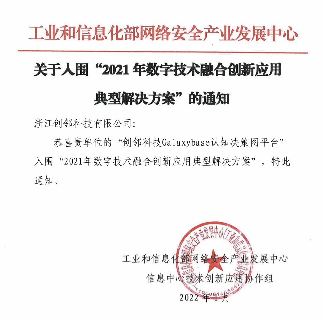 近日,工业和信息化部网络安全产业发展中心下发“2021年数字技术融合创新应用典型解决方案”入围通知。“创邻科技Galaxybase认知决策图平台”凭借在技术先进性、应用示范性和产业带动性三大要素方面的优秀表现,从429家申报单位663个解决方案中脱颖而出,成功入围。