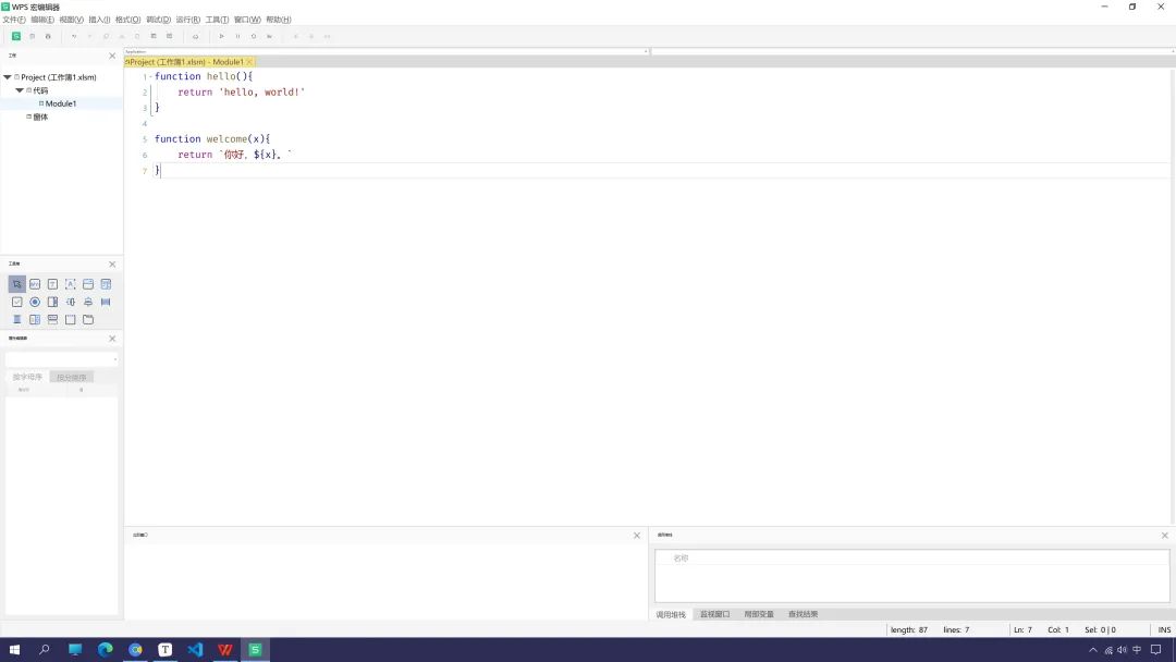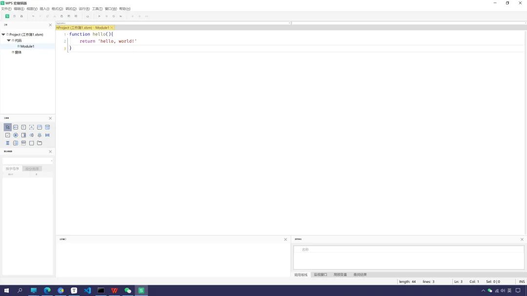 好,打开wps-开发工具-wps宏编辑器,尝试下写下第一行代码。