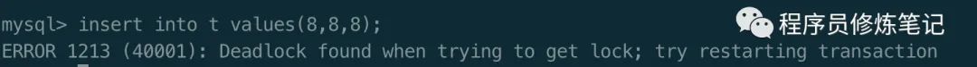 Session B的insert会被阻塞,Session A在执行insert的时候会检测到死锁,如下图: