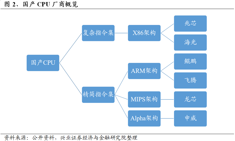 在经历数十年的艰辛探索后,目前,国产CPU产业已初具规模,涌现出一批领军企业。我们根据CPU指令集体系进行分类: