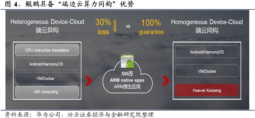鲲鹏具备“端边云算力同构”的优势。鲲鹏CPU基于ARM V8架构,处理器核、微架构和芯片均由华为自主研发设计。市场上目前存在超过500万基于ARM指令集的安卓应用,与ARM服务器天然兼容,无需移植即可直接运行,且运行过程中无指令翻译环节,性能无损失,相比X86异构最高能够提升3倍性能。
