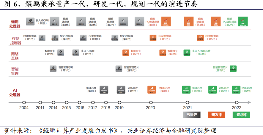 鲲鹏是华为计算产业的主力芯片之一。为满足新算力需求,华为围绕“鲲鹏+昇腾”构筑双算力引擎,打造算、存、传、管、智五个子系统的芯片族,实现了计算芯片的全面自研。鲲鹏系列包括服务器和PC处理器。近年来,华为先后推出Hi1610、Hi1612、Hi1616等服务器CPU产品,不断实现主频与核数的提升,并最终开发出当下的旗舰产品鲲鹏920与鲲鹏920s,分别用于服务器和PC机。