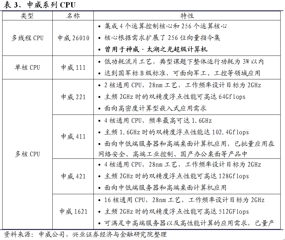 申威432、443、3232在研。申威432、443均为4核CPU,分别采用第四代、第五代申威核心,主频将分别达2.2-2.5GHz和2.8-3.0GHz,综合性能将分别达到同期国际主流桌面CPU的60%和80%。申威3232为32核CPU,主要面向云计算、大数据领域,综合性能预计为同期英特尔主流服务器CPU的60%-70%。