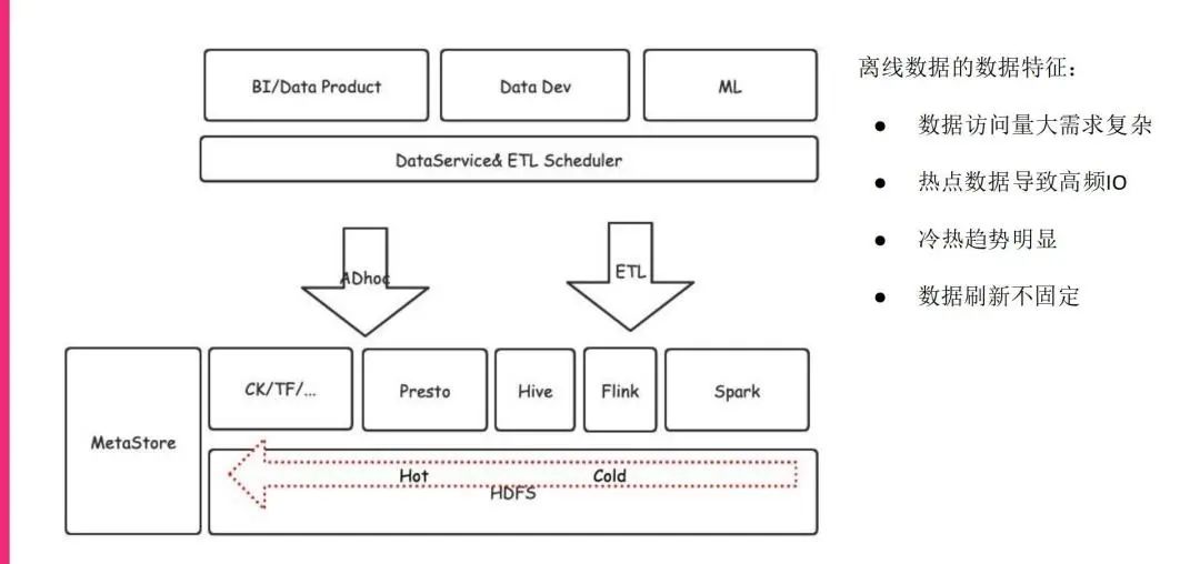 最底层的话就是冷数据,往往我们生成完了这些历史的Data Pipeline的数据,它在过了一段时间之后,就没有人再去访问了,但是可能对于一些特殊的事件,比如说大促的时候,会进行一些对照的分析,所以这些数据会要求长期保留的,但是平均的访问时间其实很低几乎没有,所以我们认为这些是冷数据。