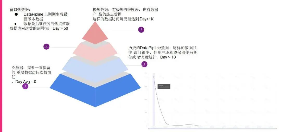 我们发现,金字塔最顶端就是那些极热的数据,往往是我们经常要查询或者说要look up查询的一些维度表,它们的数据量甚至能够达到一天要访问1000次以上,这里的次数是已经做完清洗,去除掉文件数量干扰的,所以就是那一份数据的准确访问次数。