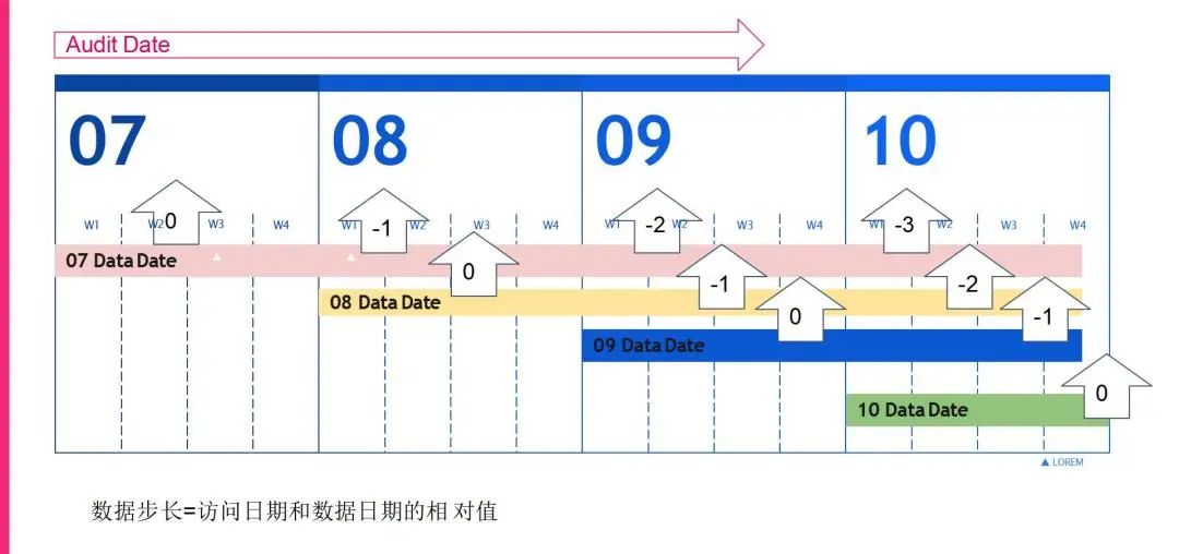 就是说随着日志访问的日期往前推移,我们的数据产生的时间和日志日期之间的相对差值就是步长。比如说我在7号生成的数据,相对于7号这个日志日期来讲是0的步长,到了8号之后,我7号产生的数据就变成了-1的步长,到了9号就是-2,以此类推,那我8号的数据在8号来讲也是0的步长。