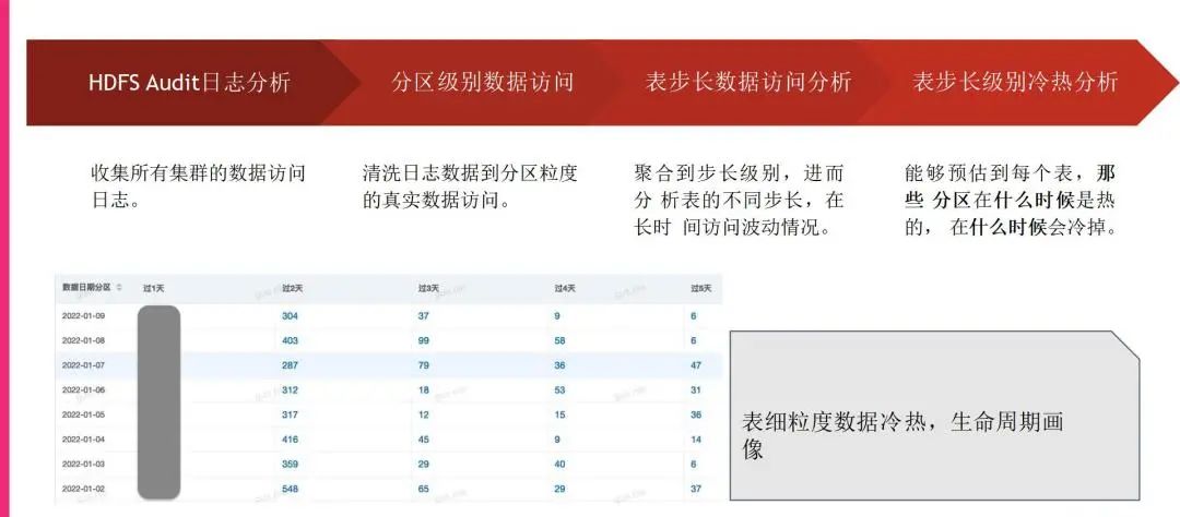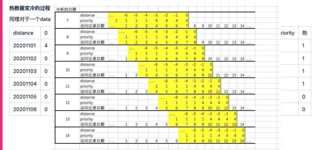 所以通过这个相对步长,我们就能够比较清晰地看到,针对于日志日期往前推,相对步长的数据访问其实是比较固定或者相对固定的,也就是说一张表的数据,今天日志生成的今天数据日期的数据,实际上访问量基本上是固定的,今天生成数据到明天就是-1的步长,这样的数据访问的量级也是相对固定的,可能会降一个量级。