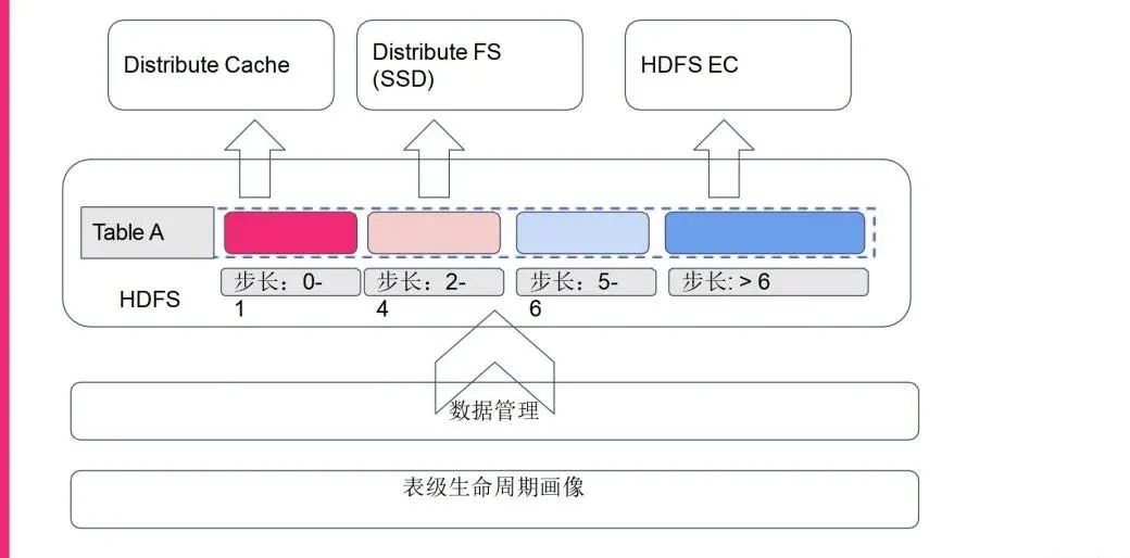 基于步长的分析思路,我们对于现在要进行的缓存进行了设计,我们希望基于现在做的表级生命周期的画像,推进数据管理。那么数据管理支配哪些表的哪些相对分区,或者说相对步长的分区,来进行缓存或相对处理?比如说它的步长大于6时,我们分析下来其实基本上是没有人访问的,那么我们就推进去做EC的数据;如果访问步长是2~4或者说5~6,我们认为是一个温热的场景,我们可以推到SSD这样的持久化存储上面去;如果说相对步长是非常小的,比如说0~1上面,访问次数如果是非常大的话,我们可能就会在一开始插入数据的时候,或者说是在比较前面的时候就会把它推到分布式缓存里面去。