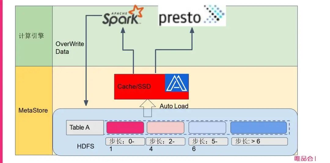 后面我们也对比了很多其他方案,我们其实也试用过 HDFS Cache这些方案,后来发现还是Alluxio Cache的支持比较全面,而且比较专注这一块。所以我们最后还是挑选Alluxio来做分布式缓存。顺便提一句,我们现在的大部分的数据ETL load已经转换为Spark了,所以我们的设计思路就是Spark写入数据的时候,就根据数据生命周期管理系统指定属性,在写入时就把数据自动化地加载到Alluxio Cache里面去,后续其他的Spark任务或者Presto的AD hoc任务,或者说其他的一些计算引擎来读取的时候,就直接能够切换到Alluxio上面进行读取,这就是我们总体的设计思路。