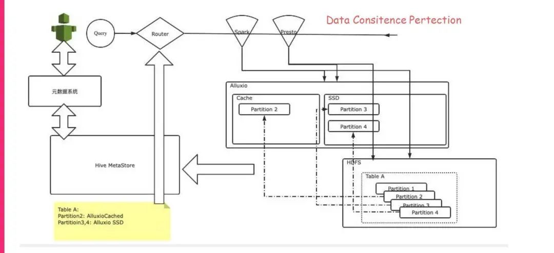 刚才提到,读取的时候也会先去读一下Metastore。我们现在的读取的切换是在逻辑执行计划优化器里面,我们自己写了一个优化来做到的,发现这块相对步长的分区已经在Alluxio里面了,那么我们就直接把访问比较自然地切换成Alluxio来进行Alluxio读取,而且Alluxio自身也是有读穿(Read-Through)功能的,可以读到底层的 HDFS数据,所以不可能会出现读不到数据的问题。