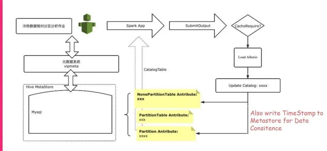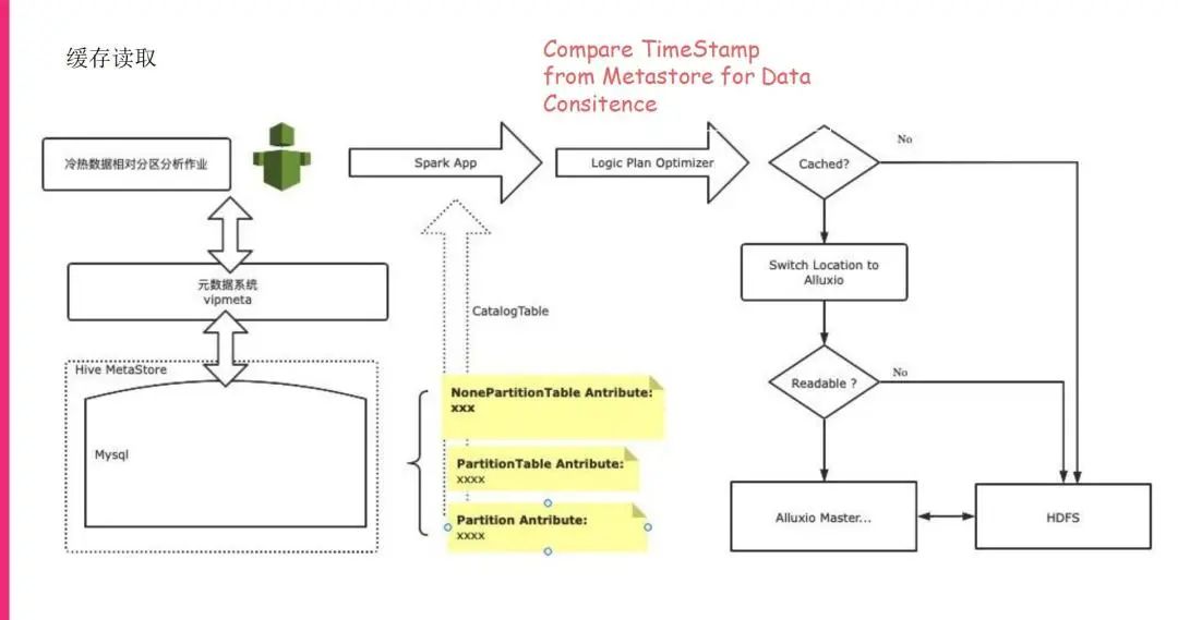在写入的时候,这个作业在提交之后,会先去Metastore里面去读取自定义的cache的标签属性,然后确定是我们需要进行的,我们就会把这块数据落地HDFS,但是也会把它加载到Alluxio里面去,最终我们要再去修改一下Metastore,把这个Cache的属性再保存进去。