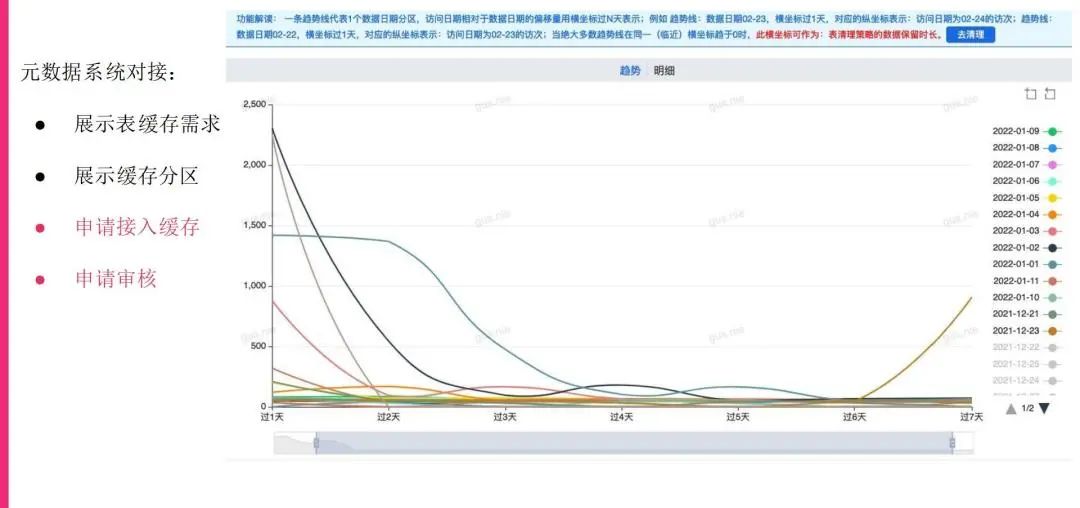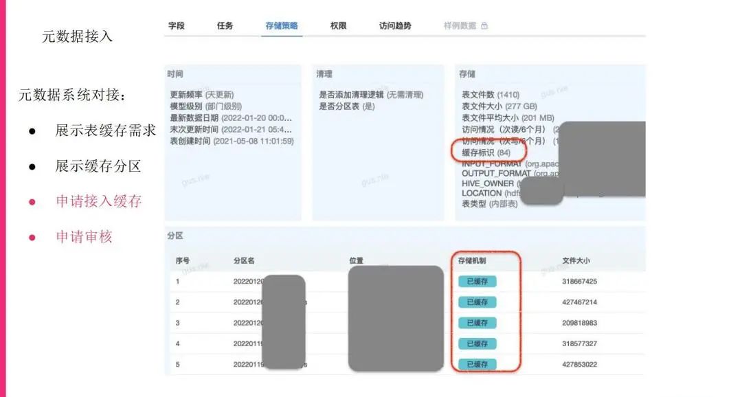 这个就是我们在读写上面的大概设计。后续我们不仅仅要做到Alluxio读写的方案,也要做到对用户透明,所以我们也需要把做了哪些分区或者相对分区,或者说建议哪些相对分区要做缓存,能够透明给用户,让用户知道。我们首先是要让每块相对步长或者相对分区的数据访问进入到我们自己的元数据系统里面,用户可以通过元数据系统明确地看到相对步长的分区和数据访问的趋势。目前我们是做到了展示表缓存需求,就是它需要缓存以及有哪些分区已经缓存了。我们还没有做的是整个申请的流程,包括审核,现在正在做,后续我们的目标就是用户可以根据这些用户数据信息,自己能申请把数据放到缓存,审核人也来审核这个申请,如果看到这个数据的访问确实是足够大的,就把它放进去。