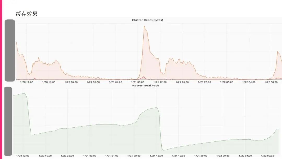 这是我们的缓存效果的展示,大家可以看到,现在上线之后基本上提供给一些 AD hoc和比较关键的作业,这些作业都是非常有特点的,就是在特定的时间会被集中性地访问,特定的时间也不是完全固定的时间,在大概的时间要不断地刷新,所以大家可以看到在特定的时间上面数据的访问,还有写入的文件path,这些在特定时间都在飙升。