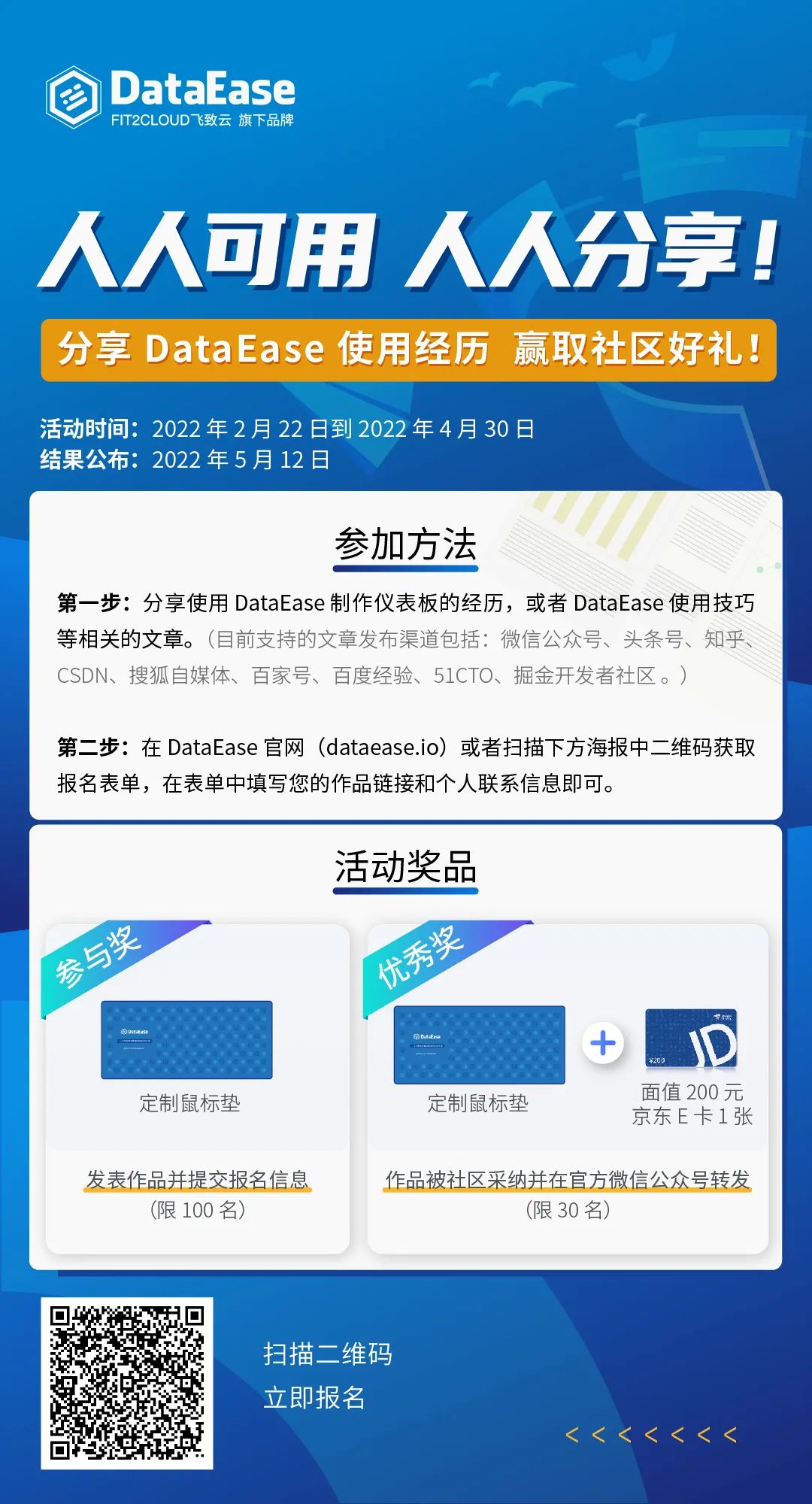 2月22日,DataEase开源数据可视化分析工具发起有奖征文活动。分享使用DataEase制作仪表板的经历,或者DataEase使用技巧相关等文章,即有机会赢取精美礼品及DataEase周边,快来参加吧!