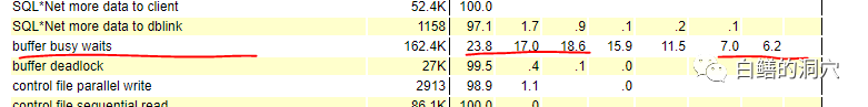 这种场景下,有时候会出现free buffer waits和write complete等待。这种情况下,可能存在两方面的问题,一个是IO性能不足,一个是DB CACHE过小。这种情况,调整下DB cache,适当的调整下KEEP POOL,把一些热点小数据放入KEEP POOL,可能就能起到缓解的作用。