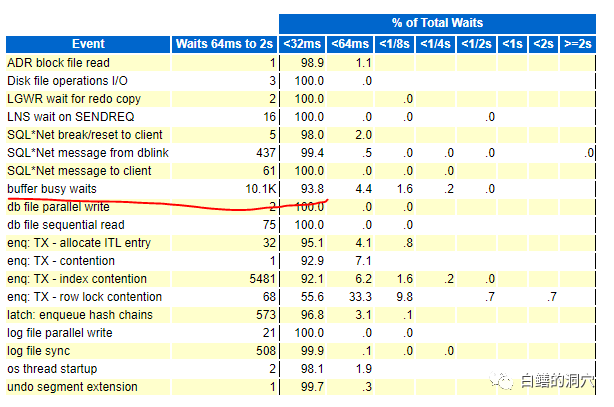 昨天介绍了一个BBW的案例,这是一个制造业DCS的案例,那种短时间的BBW问题尖峰也不过几分钟时间,在半小时的AWR报告中看到的平均BBW延时是9毫秒。一般来说9毫秒的延时不会对系统性能造成很大的影响,但是大家看到的AWR中所有的数据都是采样周期内的平均值,只有通过柱状图才可以更清晰的看到具体的BBW情况。