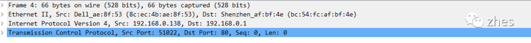 在上图中,可以很明显看到MAC层、网络层、传输层的信息。标志文SYN=1,这是一个请求连接报文,在发送该报文之后,客户端进入SYN_SENDING状态,等待服务器的确认。