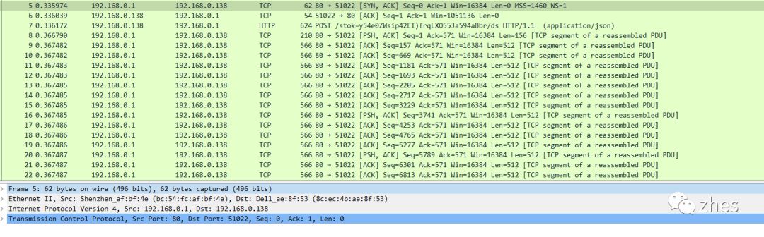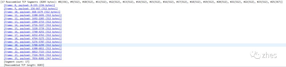 仔细观察TCP segment中的内容。可以看到TCP payload部分有frame的排序,在服务器向客户端发送的响应报文中有该响应包含的TCP frame的序列号,具体的原理还需要研究下TCP协议,这里暂时就不说了。