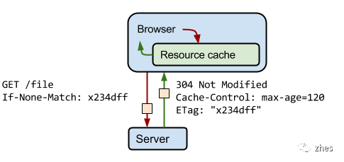如图所示,客户端自动在'IF-None-Match' HTTP请求头内提供ETag令牌。服务器根据当前资源核对令牌。如果未发生变化,服务器端返回‘304 Not Modified’响应,告知浏览器缓存中的响应未发生变化,可以再沿用120秒。