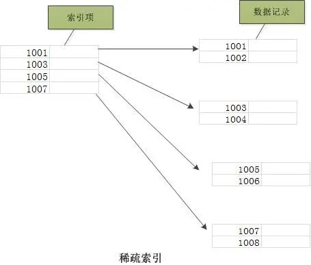 索引主要分为线性索引、树形索引和多级索引。下面将简单介绍一些基础的索引实现方式以引出MySQL的索引实现。所谓线性索引就是将索引项集合组织为线性结构,也成为索引表。虽然MySQL常使用树形索引,但是线性索引的有些性质和树形索引是相通的,所以先简单介绍一下两种比较常见的线性索引。稠密索引在线性索引中,将数据记得每一条记录都对应一个索引项,并维护一个索引表。由于在真实环境中可能需要应对大量的数据,所以对于稠密索引的索引表来说,索引项一定是按照关键码有序的排列。索引项有序就意味着可以直接对索引表进行像二分查找、插值查找、斐波那契查找等高效率的查找操作,大大减少查询的时间复杂度。但是稠密索引也有一个明显的缺点,对于大量数据状态下索引表会变得非常的长,如果全部取出内存的话将会占用大量内存空间。1.1.2 分块索引