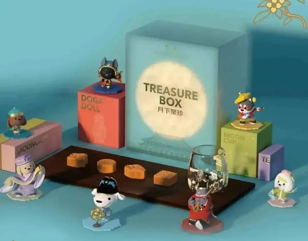 百度的中秋礼盒使用了深蓝色做外包装,双开门设计,月饼为传统样式。同时搭配无线充电座以及5款具有京剧元素的手办。