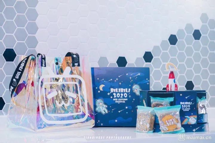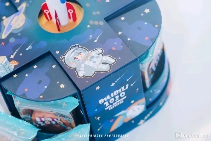 B站的礼盒外观设计成更为简单的火箭搭载台,插画上面同样加入了宇航员元素,随礼还透明镭射包包,颇有时下大热Y2K风格的影子,非常潮流时尚。