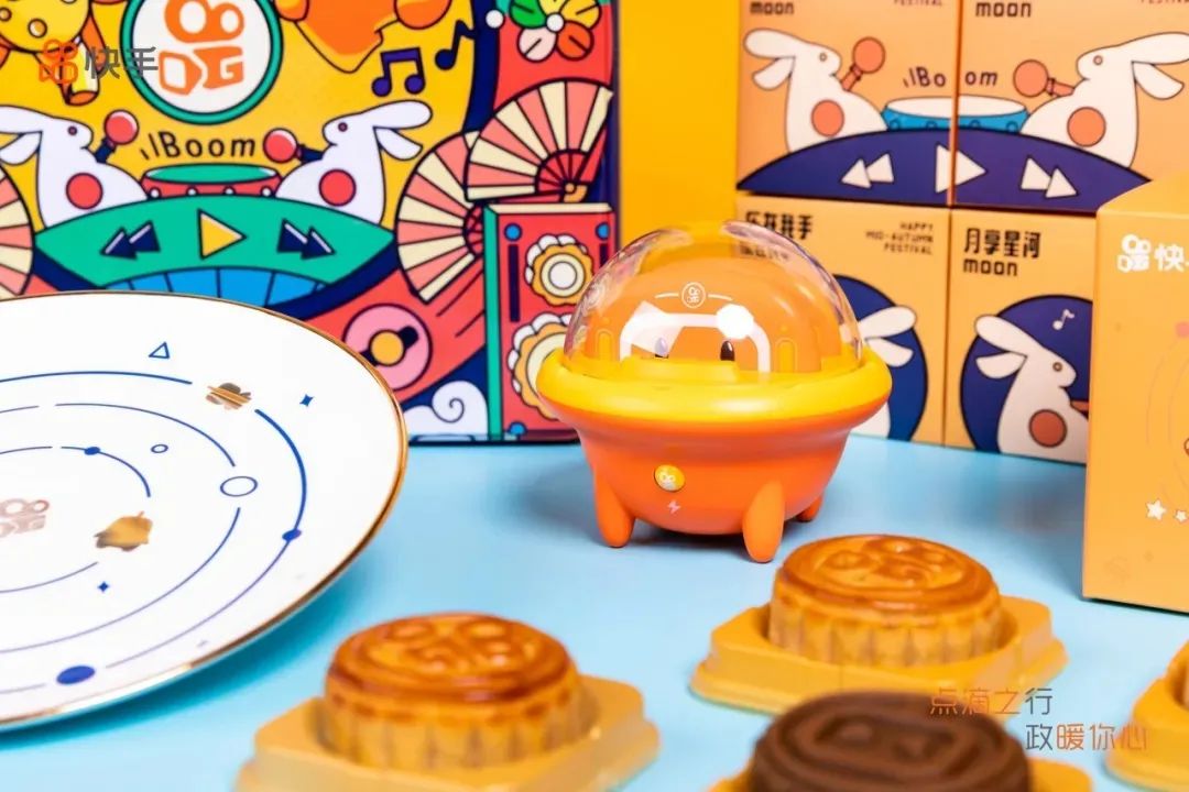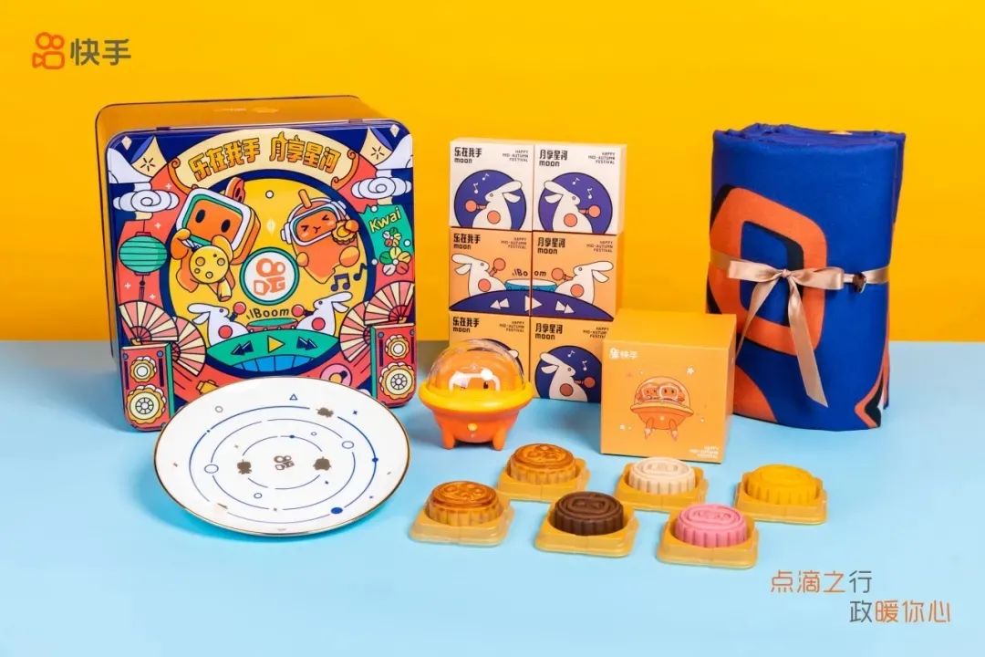 礼盒的第一层是6枚月饼,第二层是印有星轨图和快手logo的磁盘,第三层内容就非常丰富了,又萌又可爱的小飞船充电宝,还有一条精致的小毯子,满满的心意有没有