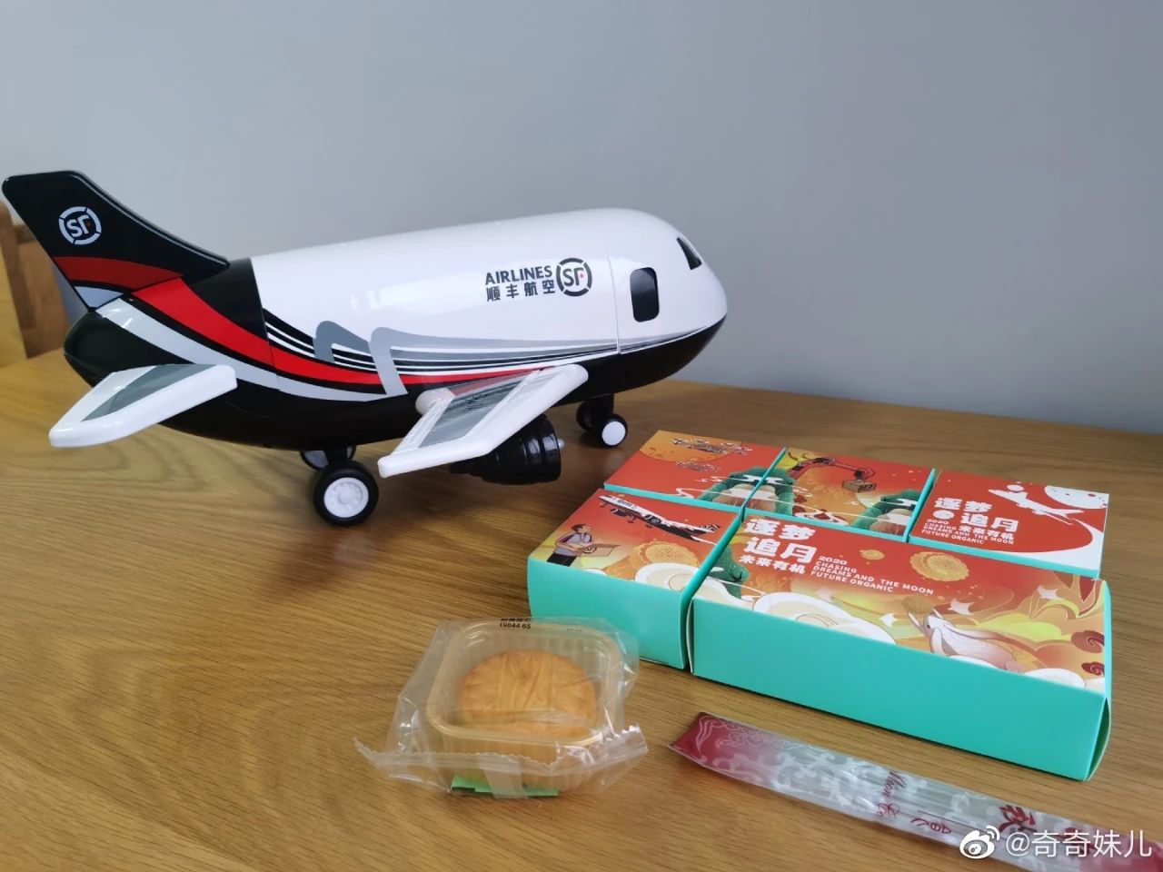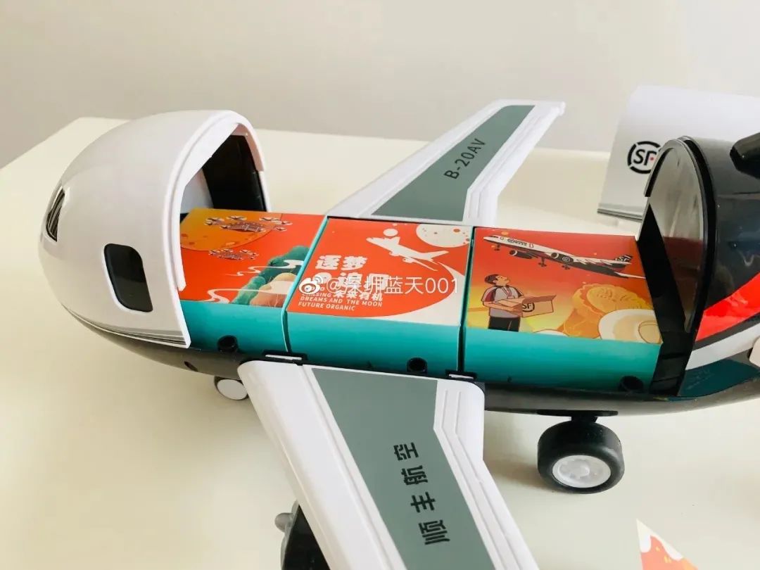 去年送车的顺丰,今年直接送飞机了,今年顺丰中秋礼盒主题是“乘丰揽月”,打开飞机装置,6块月饼一字排开,比硬核,还是顺丰厉害些。