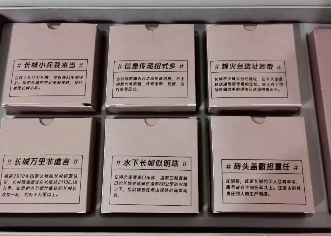 打开之后还算精致,虽说没有去年的表情包呆萌,但是每个盒子背后都有一个长城科普知识,诸如长城守卫方式,烽火台信息传递方式......也算十分用心了