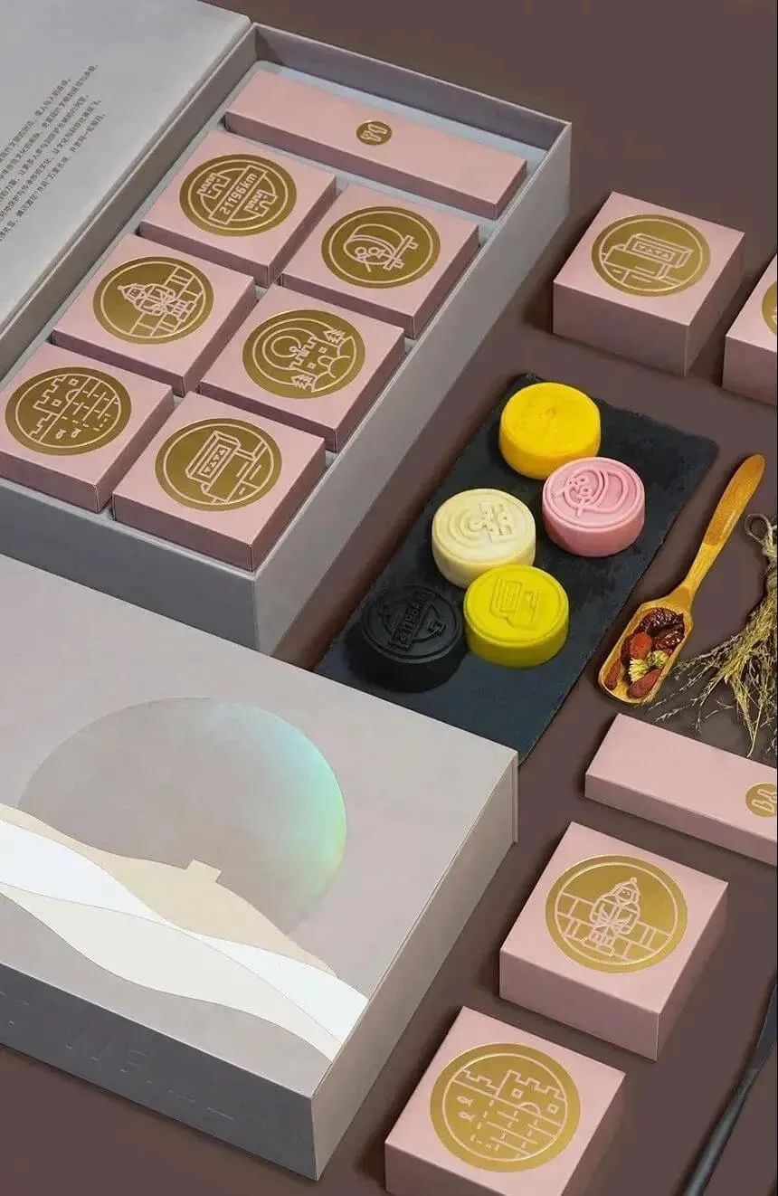 抽盒的设计加入了月亮的圆缺变化,颇为用心,月饼的盒子则是融入了几何元素。