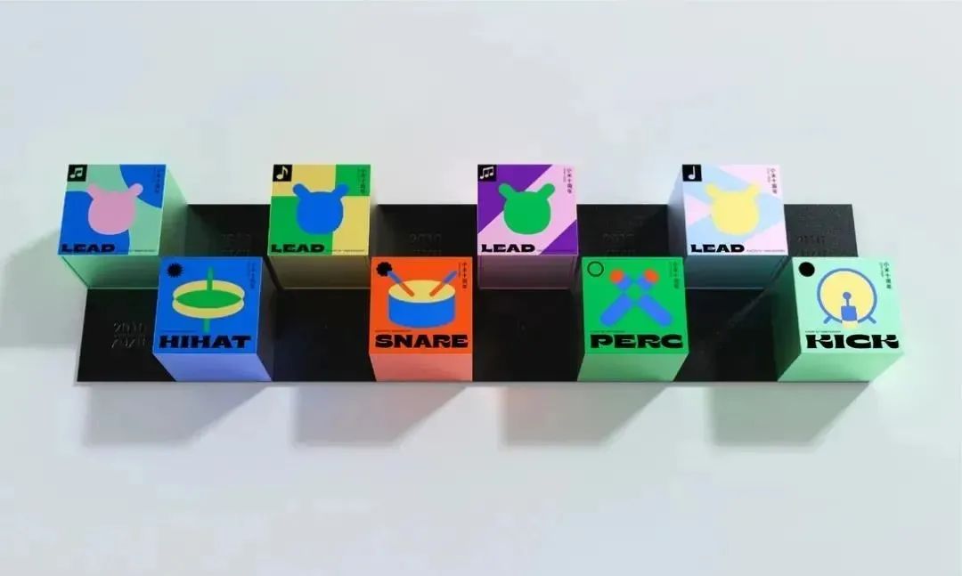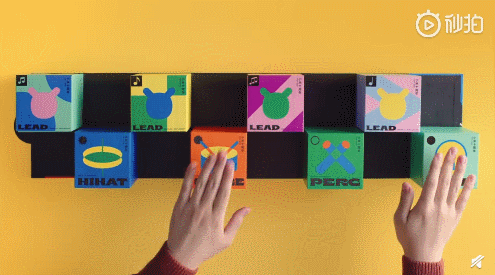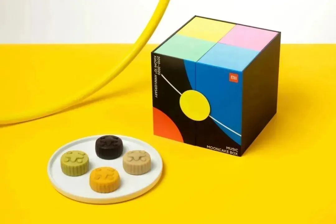 展开后的内盒则是错开排放的独立包装,正面绘有乐器以及乐手图案轮廓,当敲击月饼盒,会自动播放MIUI铃声,而且不同盒子对应不同乐器哦~~~简直不要太创意。
