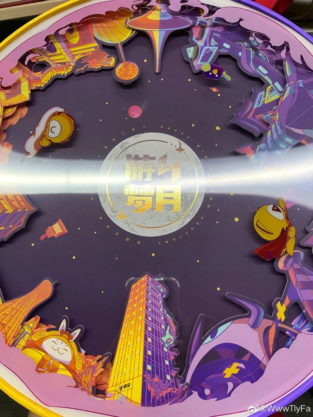 透光部分,巧妙结合纸灯上的绘画,一副是网易员工所在的城市地标,与火厉(网易游戏吉祥物)欢聚月光之下,尽显网聚人的力量。