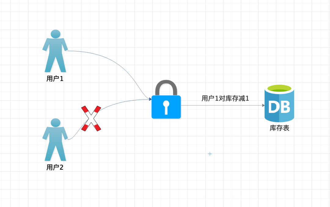 对于以上这个场景来说,我们需要用到锁机制来保证每卖出一件商品,对库存进行更新操作时,其他用户请求不能对该商品库存进行修改;换句话说,用户 1 拿到了修改库存的锁,则只有用户 1 能修改数据,而用户 2 只能等着不能修改数据。如下图所示: