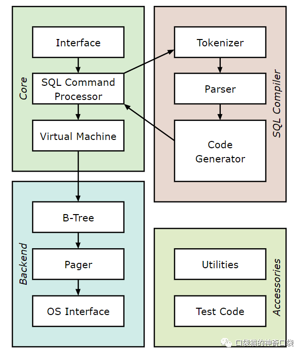 一个单机的数据库系统如何实现可以参考sqlite的实现原理,SQLite实现了一个小型、快速、独立、高可靠性、功能齐全的SQL数据库引擎。SQLite是世界上最常用的数据库引擎。SQLite内置于所有手机和大多数计算机中,并捆绑在人们每天使用的无数其他应用程序中。其功能架构如下图: