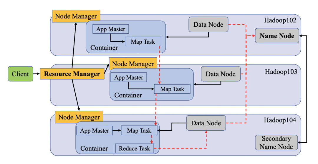 客服端发起请求到ResourceManager(Yarn),RM给NodeManager中的Container分配资源开启Application Master任务,如果资源分配到位则开启任务,在Container中运行MapTask,这一阶段是并行的操作,也就是Map。并行处理完毕后所有的MapTask都要返回一个结果,把MapTask的结果汇总为ReduceTask中,这是Reduce,并写到实际HDFS中存储数据的DataNode中,此时NameNode也会更新,SecondaryNameNode会进行备份。