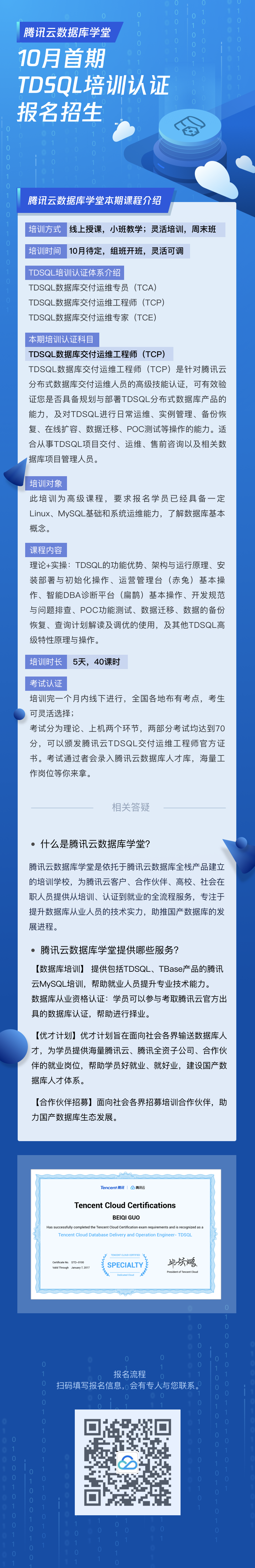 腾讯云数据库学堂自10月起,正式开放培训认证对外招生,本次提供的是TDSQL的培训,也就是说,现在无论你是在职人员还是高校学生,只要对腾讯云数据库TDSQL感兴趣的,都可以通过报名的方式进行培训和考试。
