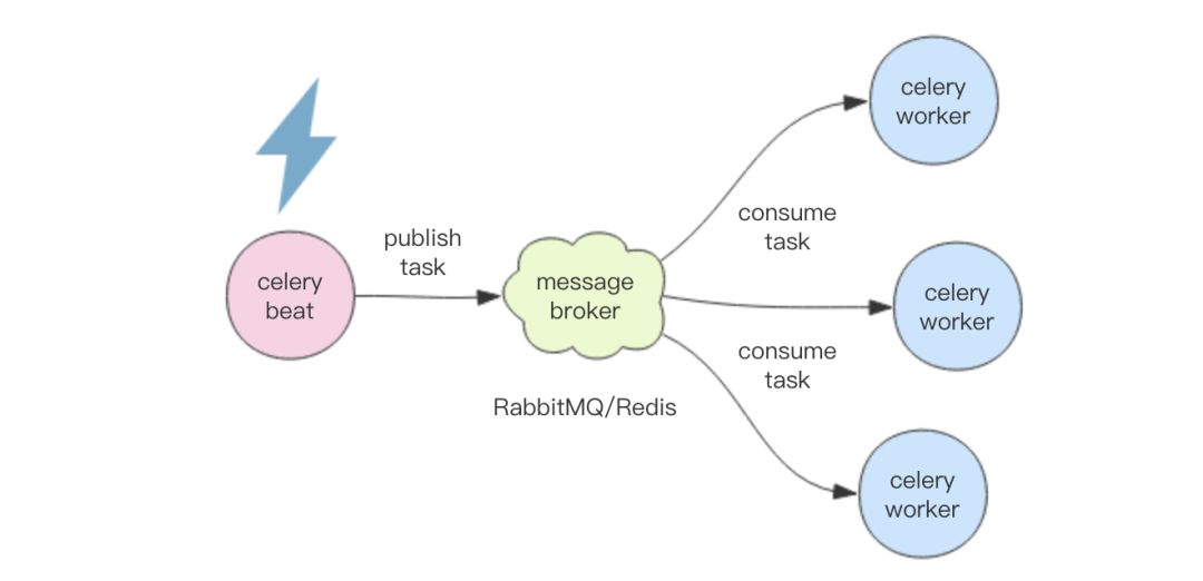 master 负责管理时间,到点了就将任务消息仍到消息中间件里,然后worker们负责监听这些消息队列来消费消息。